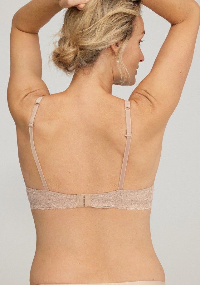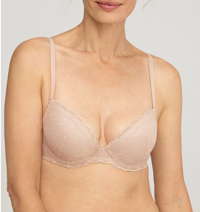 Sujetador push-up con aro para realzar el escote y crear efecto 1 talla. Confeccionado en encaje. Tirantes regulables y espalda ajustable. Incorpora pieza cruza tirantes. Patrón KARINA