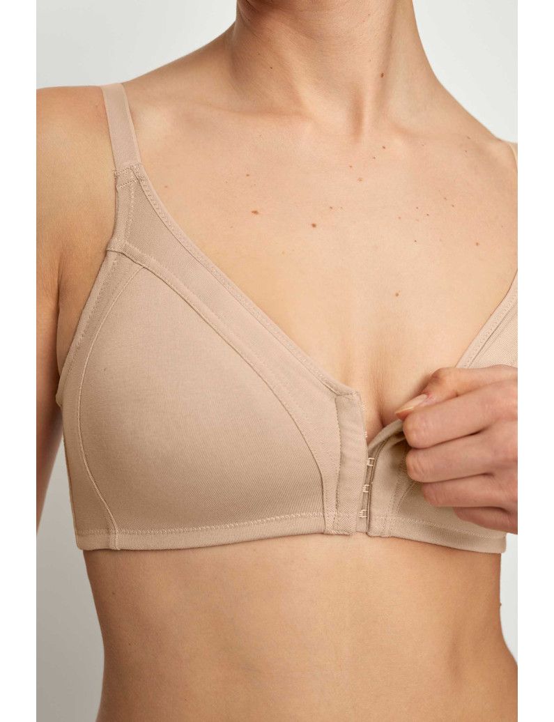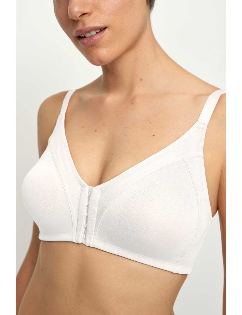 Sujetador post quirúrgico de algodón sin relleno y con copa de doble capa preformada. Apertura delantera y trasera para facilitar movimientos. Incorpora bolsillo interior para poder colocar y proteger las prótesis mamarias. Realizado en suave algodón muy agradable. Tirantes anchos y espalda ajustable para un mayor confort. PATRÓN EMMA