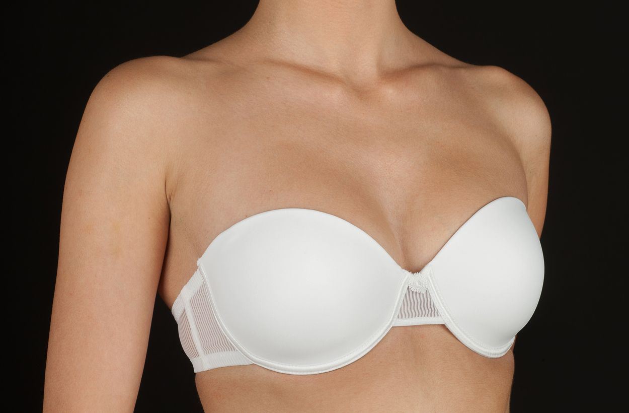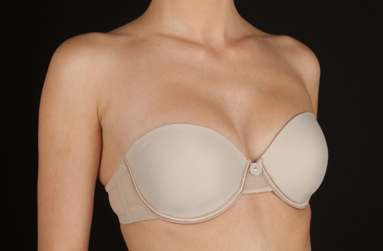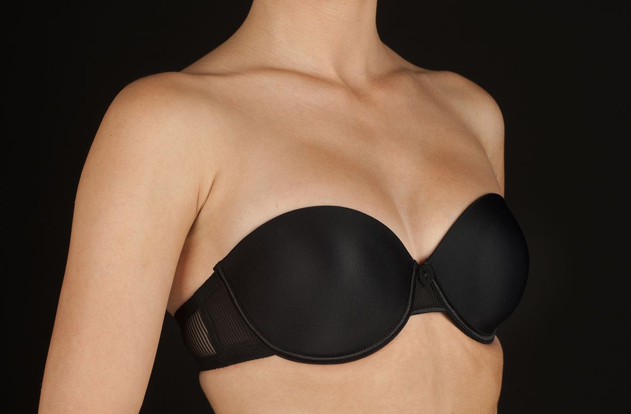 Sujetador sin tirantes, con aros y copa de relleno. Espaldilla fabricada en elegante tul tejido a finas rayas. Incluye juego de tirantes textiles e invisibles.
